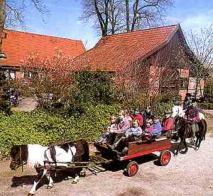 Ausritte durch die reizvolle Parklandschaft des Münsterlandes, über Holland oder durch das Gildehauser Venn, sowie qualifizierter Reitunterricht auf 3 Außenplätzen und in der Reithalle, gehören zu dem Angebot des nahegelegenen Reiterhofes (1 km). Hier können Pferde und Ponys stundenweise geliehen werden oder aber auch Reitstunden und Reitkurse belegt werden. Auch Kutschfahrten per Voranmeldung werden angeboten. Zudem gibt es auf einem in der Nähe befindlichen Bauernhof (3 km) die Möglichkeit echtes Hofleben mit allem was dazugehört kennenzulernen. Ponyreiten und Reiten, Kutschfahrten, Spielscheune, Spielplatz, Hoftiere, Streichelzoo und Kettcarbahn. In der Zeit, während sich die Kinder beschäftigen und amüsieren, können die Eltern im Café-Restaurant zwischen selbstgebackenen Kuchenspezialitäten, deftigen aber auch ausgefallenen Gerichten unserer Region wählen. Verschiedene Getränke und Eiskreationen, für jeden ist etwas dabei. Im hofeigenen Bauernlädchen erwarten Sie hausgebackenes Bauernbrot, deftige Wurstwaren und selbst gekochte Marmelade, luftgetrockneten Schinken und frische Eier. Auch finden Sie hier schöne Geschenkideen und Originelles vom Lande. |